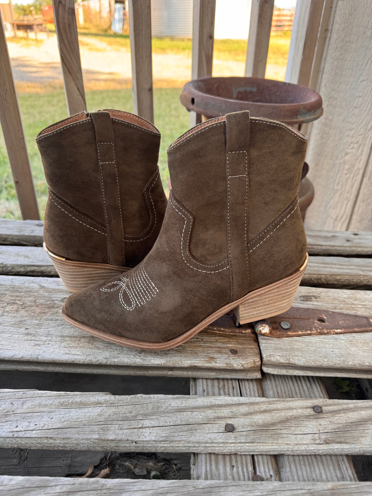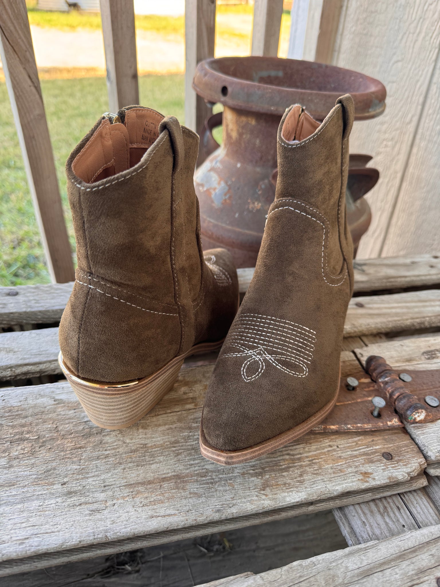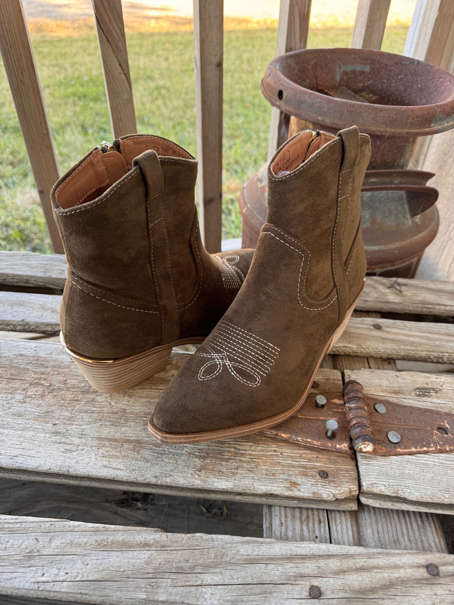 Whether you’re dressing up denim or adding polish to a fall dress, the Quittin' Time Bootie is a versatile must-have that takes your look to the next level!! Crafted in a rich dark green faux suede. A sleek side zipper makes them easy to slip on, while the subtle 2.5" heel and 0.25" platform give just the right amount of lift for all-day comfort. The standout detail? A gold-plated accent on the back heel that adds a modern, eye-catching touch!