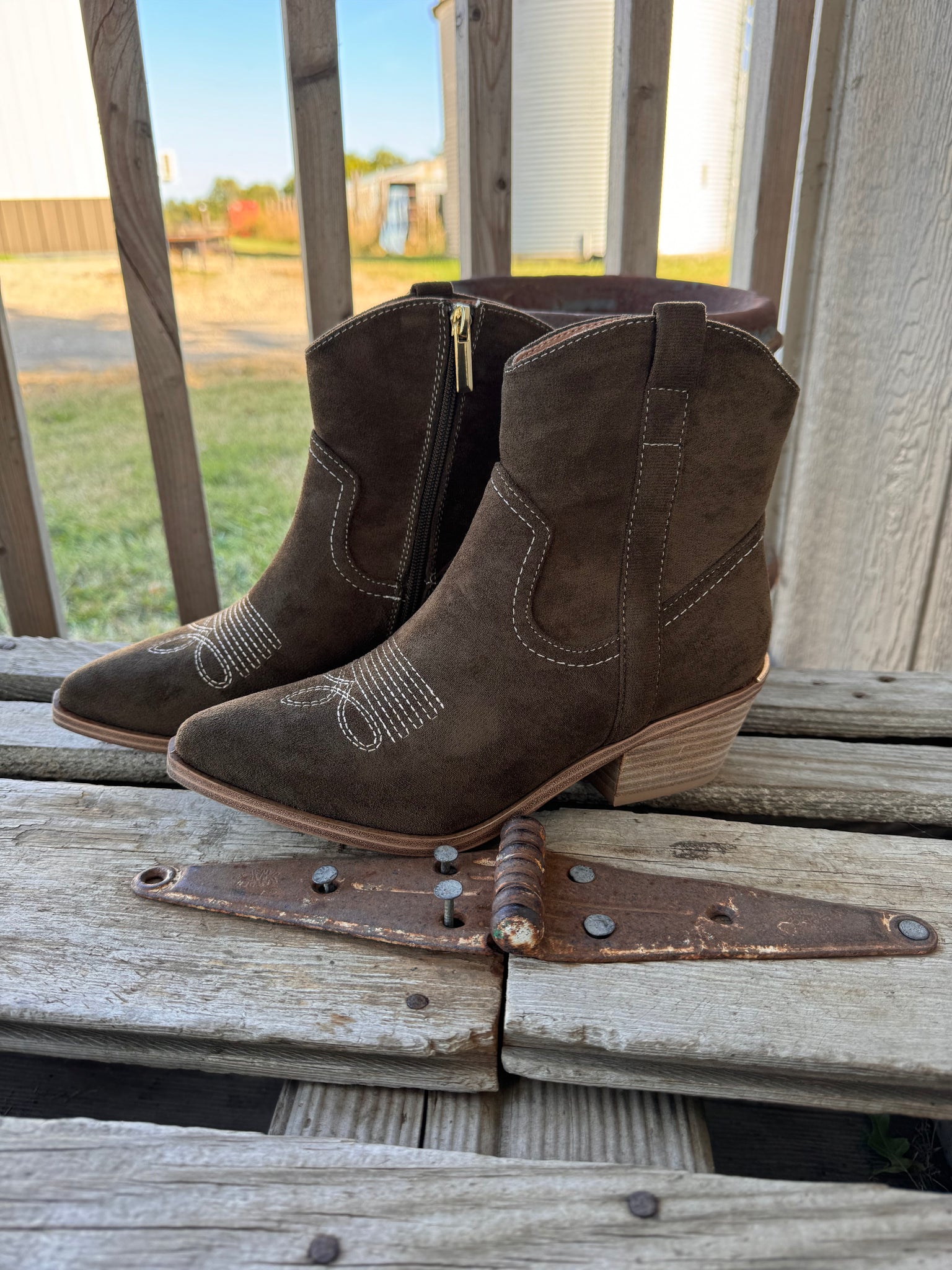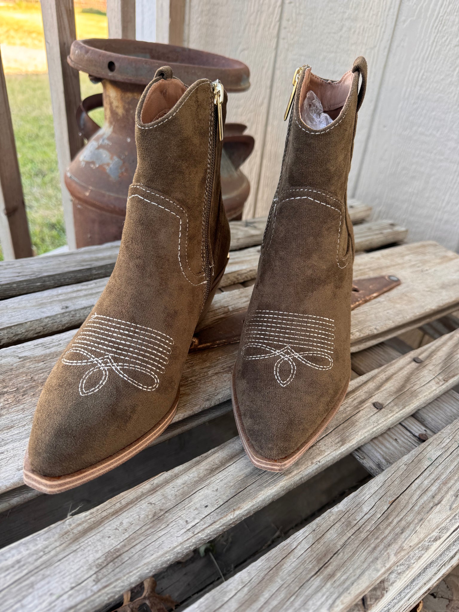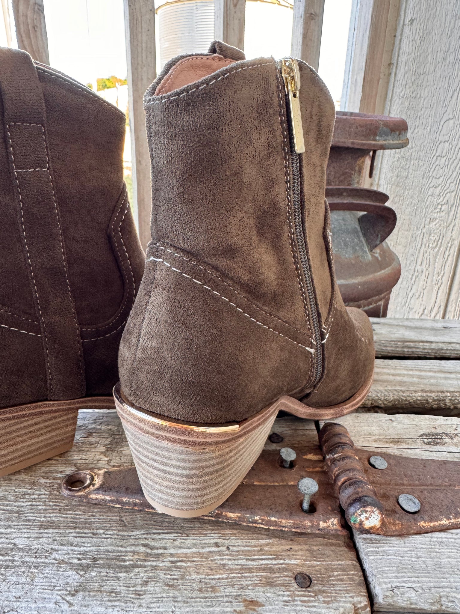 Whether you’re dressing up denim or adding polish to a fall dress, the Quittin' Time Bootie is a versatile must-have that takes your look to the next level!! Crafted in a rich dark green faux suede. A sleek side zipper makes them easy to slip on, while the subtle 2.5" heel and 0.25" platform give just the right amount of lift for all-day comfort. The standout detail? A gold-plated accent on the back heel that adds a modern, eye-catching touch!